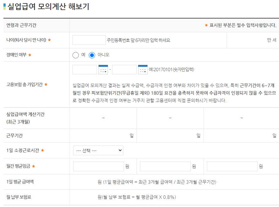 신청인의 나이 및 장애여부 그리고 고용보험 총 가입기간, 1일 소정근로시간, 월간 평균임금등을 입력하게되면 고용보험 사이트내에서 실업급여 모의 계산이 가능합니다.