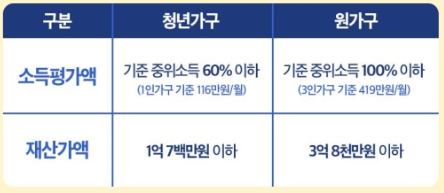 - 청년가구 : 기준중위소득 60% 이하. [1인가구 기준, 월 116만원]