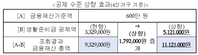 조회된 금융재산액에서 공제하는 생활준비금의 공제율이 상향 (기준중위호득 65% → 100%상당)하여 긴급 복지 생계지원금을 지급할 수 있는 금융재산 총액을 인상.