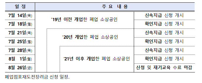 - 폐업점포재도전장려금 신청일자 : 2022. 7. 14 ~ 8. 26
