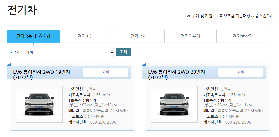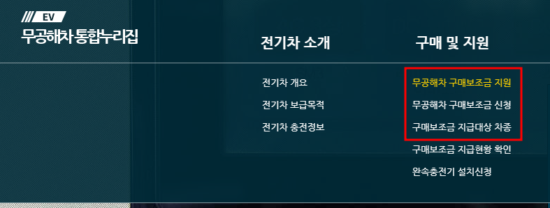 - 무공해차 누리집 접속 ▶ 구매 및 지원 클릭 ▶ 구매 보조금 지급대상 차종 ▶ 전기차 클릭.