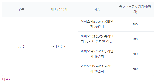 최근 출시로 핫하게 떠오르고 있는 현대자동차 아이오닉5 전기차 보조금을 살펴보겠습니다. 아이오닉 2WD 롱레인지 20인치의 경우 상한선인 700만원 보조금이 지원, 하단 아이오닉5 AWD 롱레인지 20인치는 680만원의 보조금이 지급됩니다.