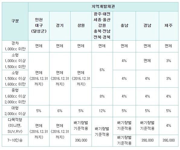 - 지역개발 채권 - 정책 또는 사업시행을 위한 자금을 위하여 지자체에서 돈을 빌리고 정해진 기간이 도래할 시 다시 되돌려주겠다는 채무를 정서하는 것으로 채권은 지방의 도로 정비, 가로정비등을 위한 비용으로 사용됩니다. 구입한 배기량과 등록을 어느 지역에 두고있느냐에 따라 채권의 종류 및 비율이 상이합니다.