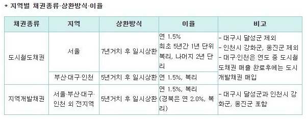 자동차 지역 개발 채권의 경우 서울 특별시를 제외한 16개 광역시·도에서 발행, 5년 만기 일시 상환 시효는 10년입니다.