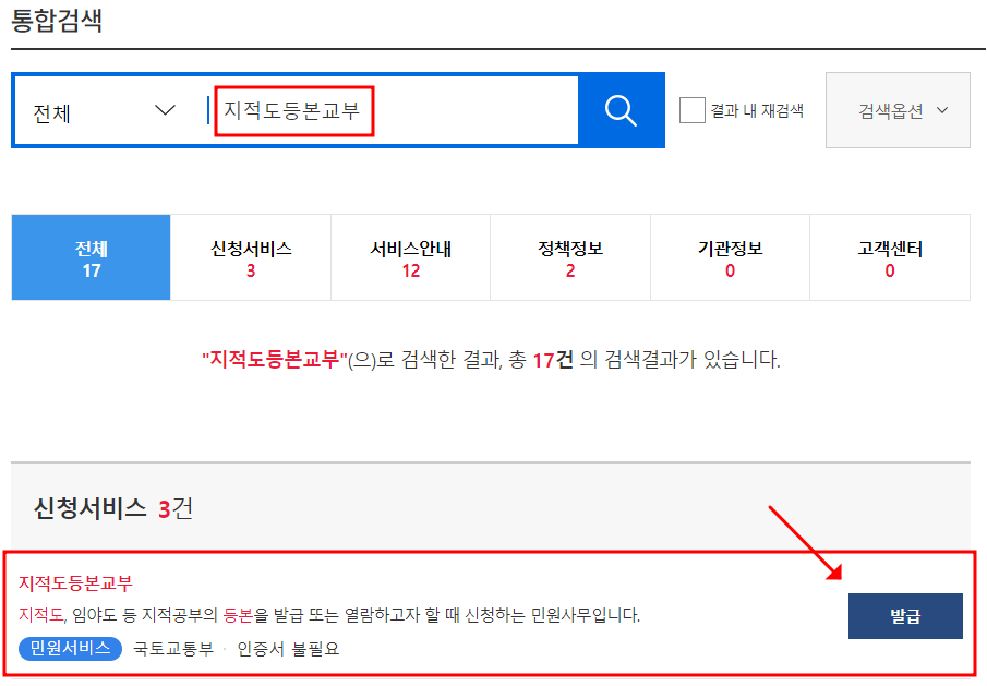 정부 24 사이트를 접속 후 자주 찾는 서비스 또는 통합 검색을 통해 지적도 등본 교부 또는 지적도를 클릭 합니다.