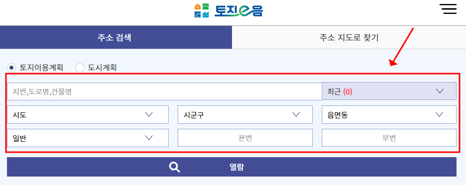 - 지번 및 도로명, 건물명 입력. (주소 지도로 찾기시 열람하고자 하는곳을 지도위에 클릭.)