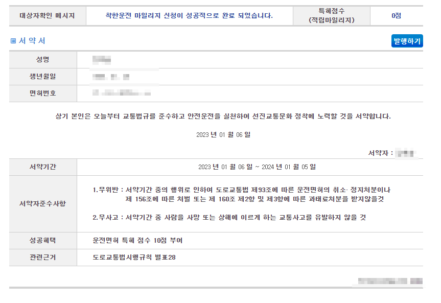 - 서약기간 동안 무사고 및 무위반 일 경우 : 운전면허 특혜점수 10점 부여.