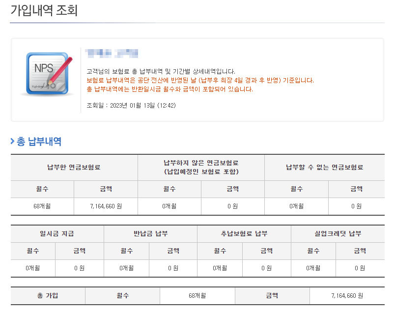 본인인증 로그인 후 국민연금 납부내역을 보게되면 본인이 납부한 총 내역인 개월수 및 금액을 확인할 수 있습니다.