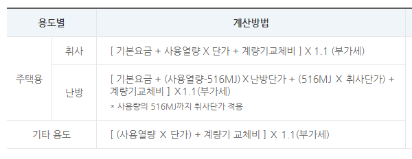 - 기본요금 : 주택용 사용자에 대하여 고객이 도시가스를 사용하지 않아도 도시가스를 공급을 위해 수요가당 매월 소요되는고정비에 대한 요금으로 사용유무와는 상관없이 매월 부과되는 요금.