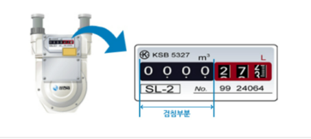 계산기 이용시 입력값은 위와 같이 검정색 바탕 숫자 부분을 확인. 도시가스 계량기에서 오른쪽 빨간부분은 제외, 왼쪽 검정 바탕 부분 4자리 숫자가 사용량입니다.