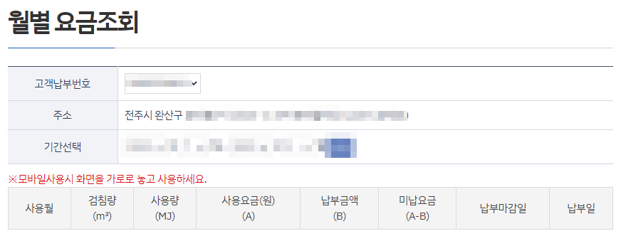 홈페이지 로그인을 진행하게되면 고객납부번호와 주소, 기간선택을 통해 도시가스 사용요금을 확인할 수 있습니다.