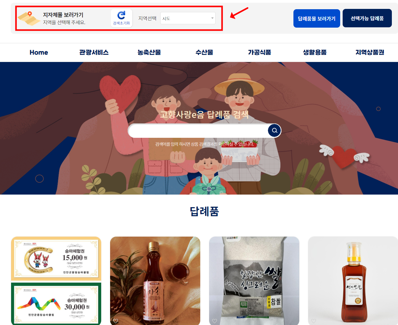 답례품의 경우 고향사랑e음 사이트내에서 확인할 수 있으며 지자체몰 검색을 통해 각 지자체별 답례품을 확인 할 수 있습니다. 또한 다양한 답례품 품목들을 제공하고 있기에 포인트로 원하시는 물품을 구입, 수령하실 수 있습니다.