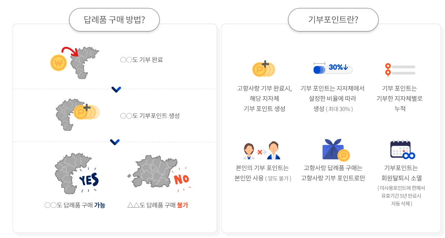 | 답례품 혜택 | - 기부금액의 30% 한도내의 답례품 제공. - 고향사랑e음 종합정보 시스템에서 고향 사랑 기부에 대한 기부 포인트를 발급, 이를 활용하여 기부한 지자체 답례품 선택. |