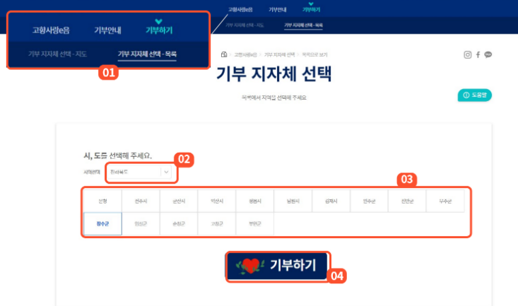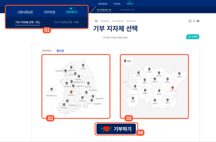 - 본인이 기부하고자 하는 지자체를 지도에서 선택하거나 목록에서 선택. - 기부하기 버튼 클릭.