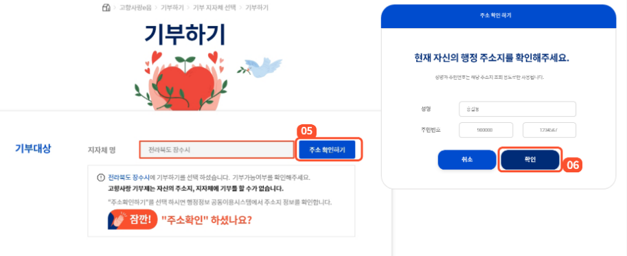 5. 주소확인하기 클릭 후 기부자 주민등록 주소지 확인.