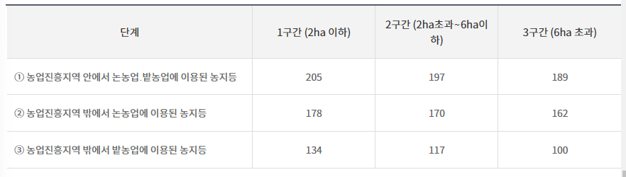 면적 직불금신청자격에 해당하여 직불금을 신청한 농업인의 경우 신청한 지급 대상 농지 총 면적에 대해 1~3구간별로 지급 단가를 적용한 금액의 합계액이 지급되며, 농업진흥지역과 비진흥지역에서 모두 경작하는 농업인은 농업진흥지역 논밭 - 농업진흥지역 밖의 논 - 농업진흥지역 밖의 밭의 순서대로 구간별 지급 단가가 적용되어 직불금이 지급됩니다.