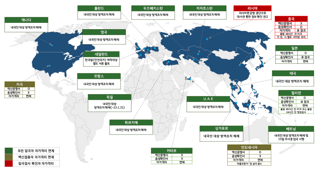 코로나 19 바이러스 관련하여 전세계 국가별 입국 제한 현황을 나타낸 이미지 입니다. 반드시 출국전에 참고하시기 바라며, 이는 2023년 3월 기준 정리된 내용입니다. 국가별 출입국 제한사항은 변경될 수 있으며, 아래 입국제한 조치의 경우 대한민국 국적 보유자 기준임을 전달드립니다. 또한 코로나 19 양성 증명서 또는 회복증명서의 경우 인천공항 코로나 19 검사센터에서 발급이 불가능합니다.