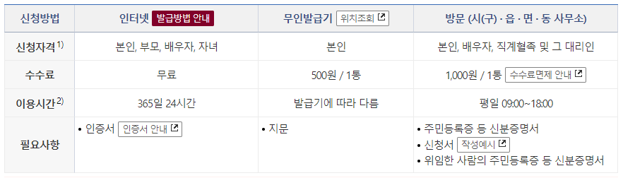 - 인터넷발급 수수료 - 무료 / 무인발급기 - 500원 / 주민센터 - 1,000원