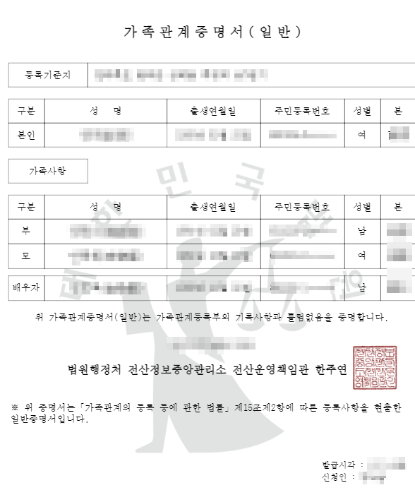 - 발급일 및 발급기관: 가족관계증명서의 발급일과 발급 기관의 정보가 표기.