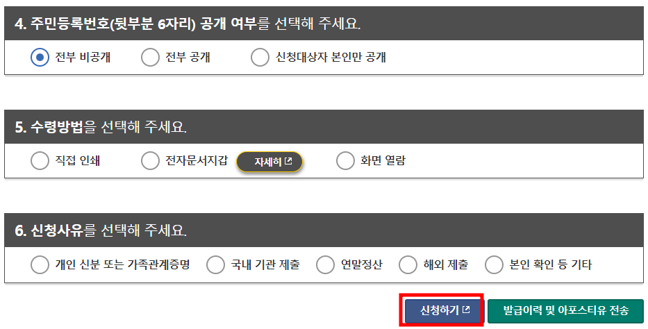 - 수령방법 - 인터넷 발급을 원할 경우 직접인쇄 선택.