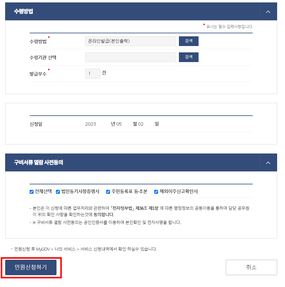 - 수령방법 - 인터넷 발급을 진행할 것이기에 온라인발급 본인출력 선택. (PDF 저장도 가능)