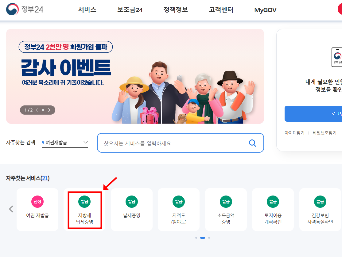 - 지방세 납세증명 클릭 또는 지방세 납세증명 검색.