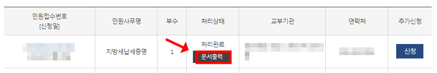 - 민원 접수번호 및 사무명 확인후 문서출력 클릭을 통해 인터넷 발급.
