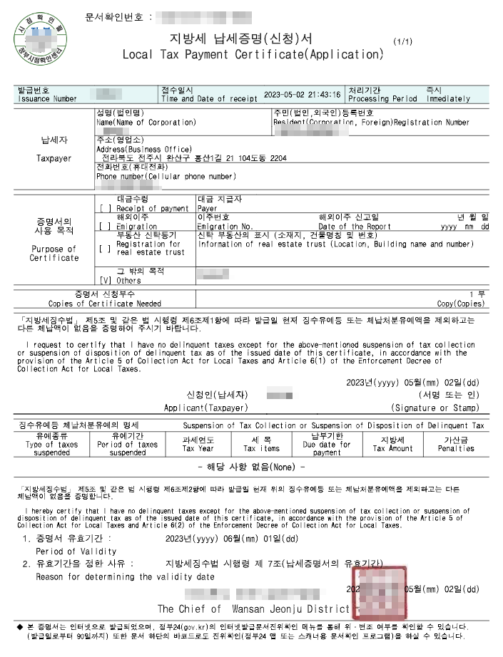 - 완납여부 : 모든 지방세가 완납되었음을 확인하는 부분.