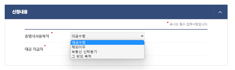 - 증명서 사용 목적 - 대금수령 / 해외이주 / 부동산신탁등기 / 그밖의 목적 중 택. (그밖의 목적 선택시 사유입력)