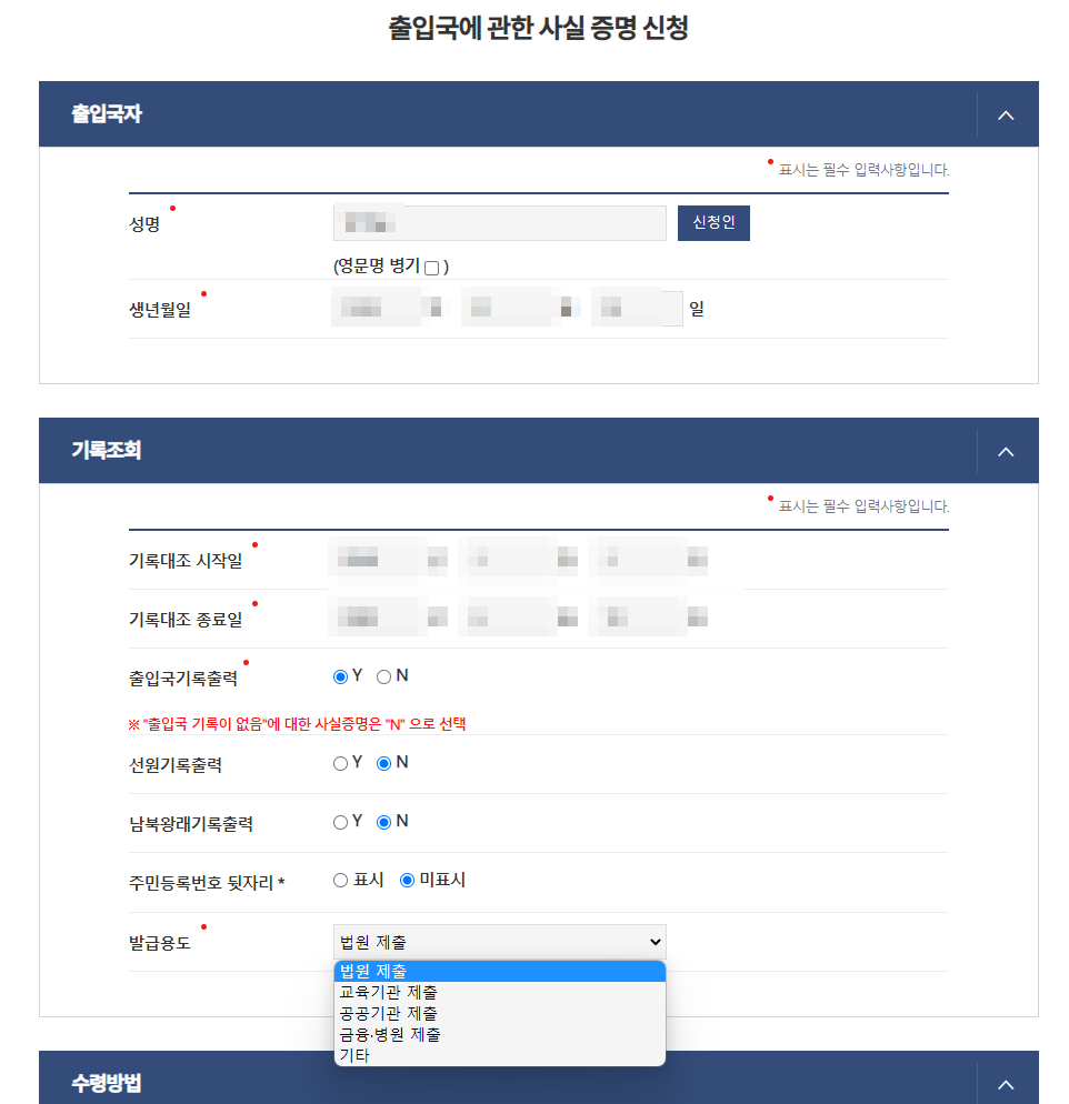 - 발급용도 (법원, 교육기관, 공공기관, 금융 및 병원, 기타 中 택1)