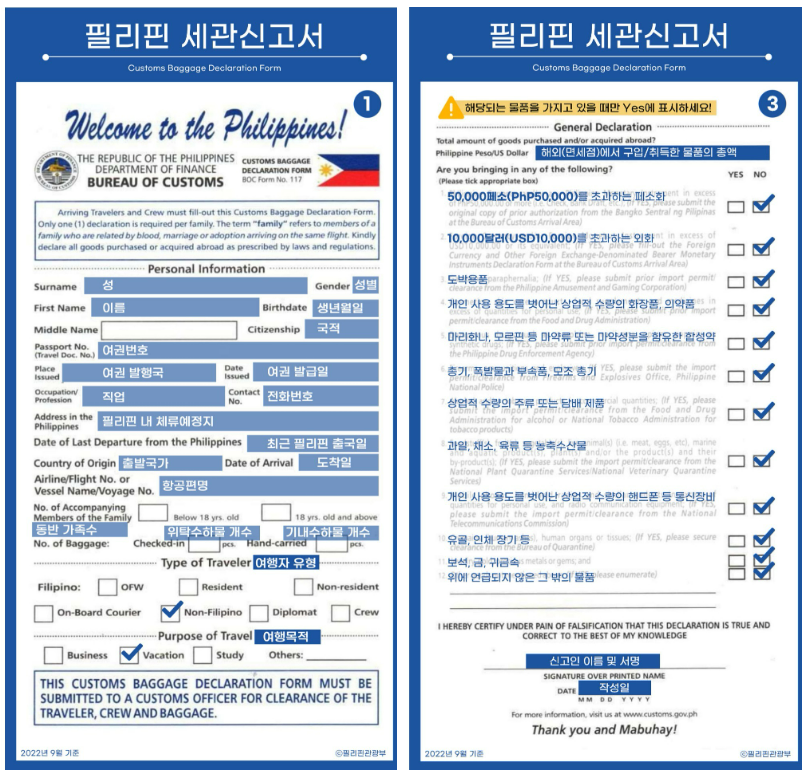 세관신고서의 경우 총 4장이 있으며 1, 3번 페이지만 작성하게 됩니다. 2번과 4번의 경우 안내문과 세관원 작성란이기에 위의 1, 3번만 작성, 생년월일 및 작성일은 월 - 일 - 년 순서로 작성해야되며, 위의 이미지에 따라 이름, 생별 국적, 여권번호, 발급일 등과 항공편명 위탁 수하물등의 정보들을 입력 합니다. 필리핀내 체류지는 숙박하는 호텔 주소를 작성합니다.