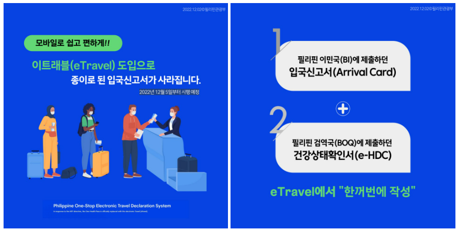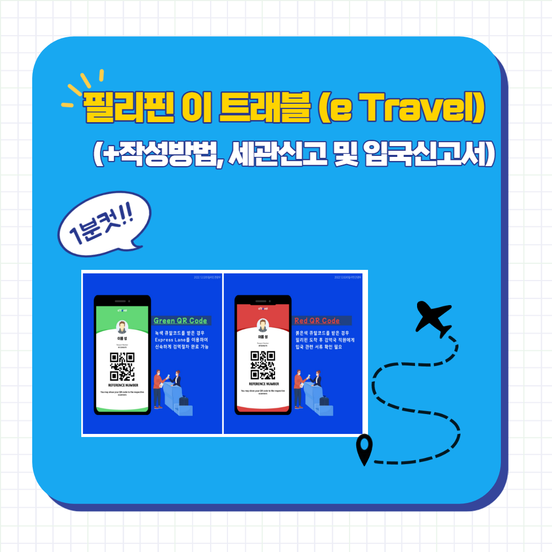종이 입국 신고서 대신 필리핀 입국을 위해서 반드시 작성해야되는 이트래블. 필리핀 이민국에 제출하는 입국신고서와 건강상태 확인서를 한꺼번헤 작성하게 되며, 이트래블은 항공기 탑승시간 기준 72시간 이내부터 등록할 수 있습니다.