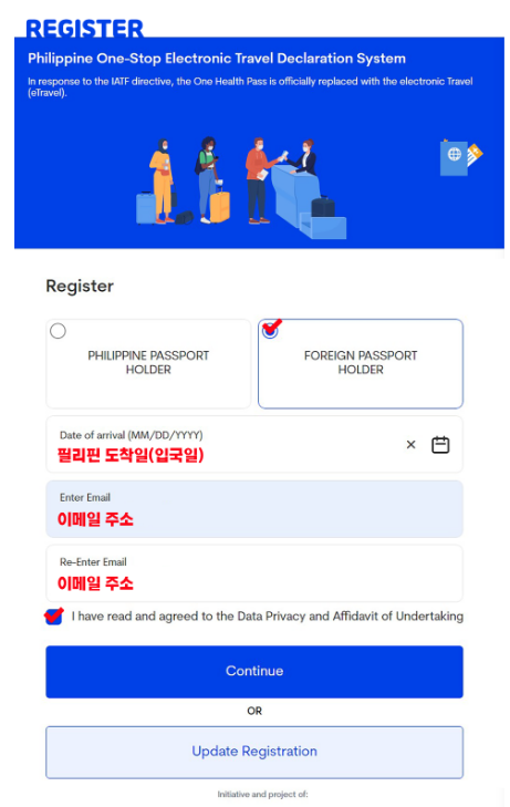 - REGISTER : FOREIGN PASSPORT HOLDER 클릭 - 필리핀 도착일 및 이메일주소 입력 후 개인정보 동의 클릭.