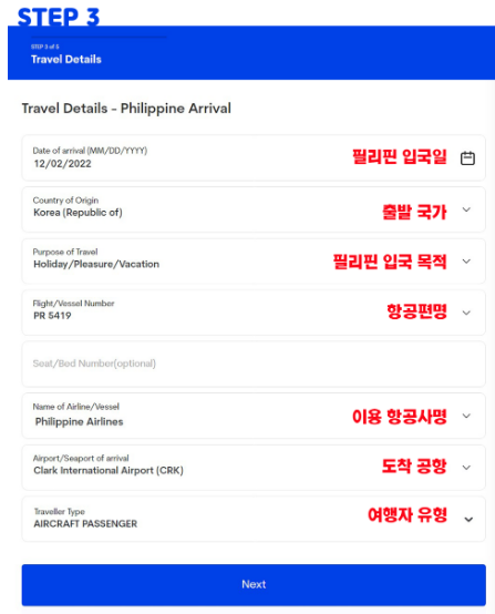 - STEP 3 : 필리핀 입국일 / 출발국가 / 필리핀 입국목적 / 항공편명 / 이용 항공사명 / 도착공항 / 여행자 유형 입력.