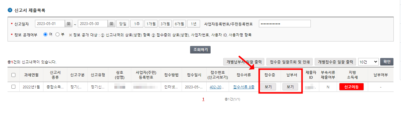 - 신고서제출목록 조회 - 접수증 보기 클릭.