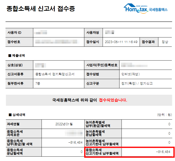 본 블로거의 경우 위 절차를 통하여 올해 홈택스를 통해 종합소득세 환급금 조회시 소득세 신고기한내 납부할 세액이 -816,484원임을 확인할 수 있습니다. 결정 세액이 마이너스일 경우 세금을 수령받게 되며, 결정세액이 기납부세댁보다 크게되면 환급금이 아닌 세금을 납부해야 합니다. (예시 : 마이너스일 경우 환급 마이너스가 아닐경우 세금 납부)