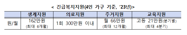 - 전세사기 피해자 지원내용 - 생계비 162만원, 주거비 66만원등 긴급복지 지원.