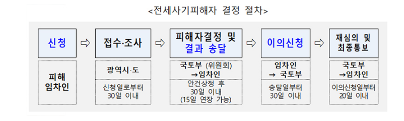 피해자 지원 신청한 임차인은 관할 지자체 조사 및 전세사기 피해지원 위원회, 심의등을 거쳐 60일 이내 피해자 여부를 결정받게되며, 이의 발생시 30일내 이의신청이 가능하며 20일이내 재심의 결과를 받을 수 있을 전망입니다.