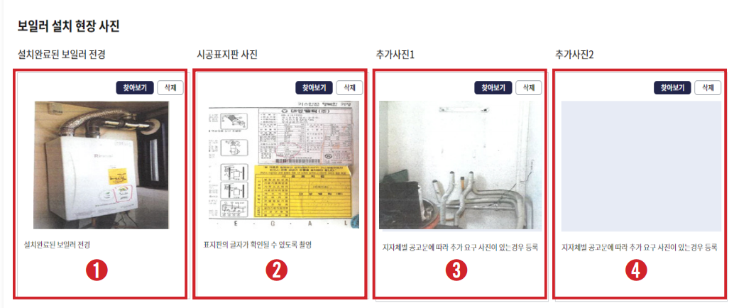 - 증빙사진 보일러 전경, 시공 표지판 사진, 추가사진 업로드