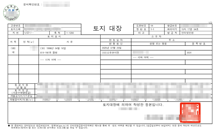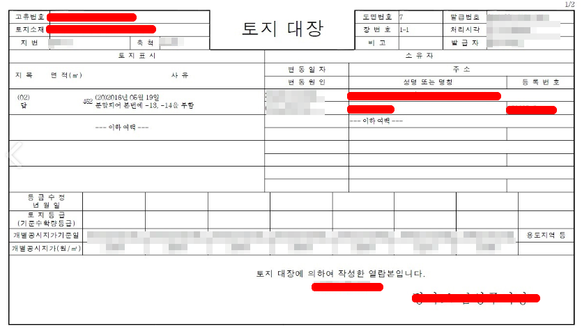토지대장이란 토지나 임야의 소재, 지번, 지목, 면적의 정보 및 소유자의 주소, 주민번호, 성명 또는 명칭등을 등록, 토지의 현재 상황을 명확하게 작성된 장부입니다.