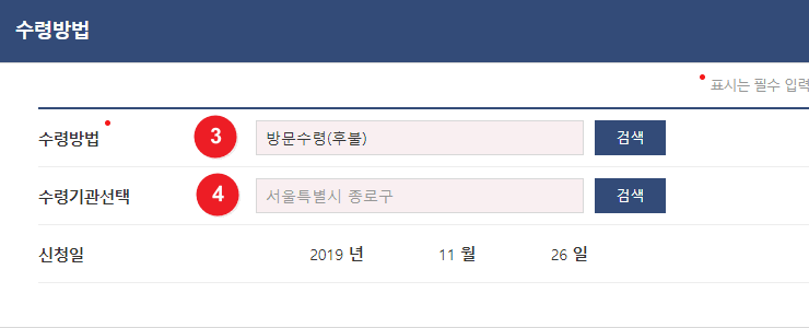 - 수령방법 선택 : 온라인발급(본인출력 or 전자문서지갑 or 제3자제출), 방문수령 중 택1