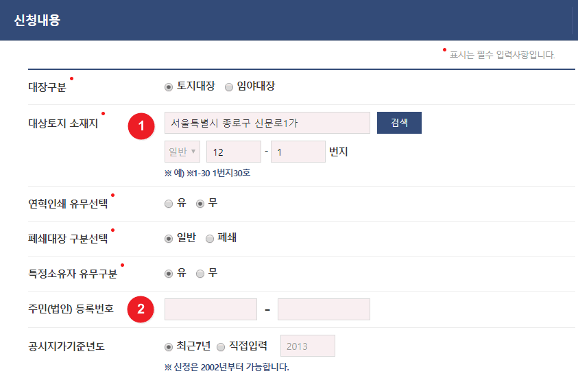 - 폐쇄대장 : 해당 대상 토지 지번이 변경, 폐쇄된 이번 번지가 표시되길 원하는 경우. - 특성 소유자가 있는 경우 주민등록 번호 입력.