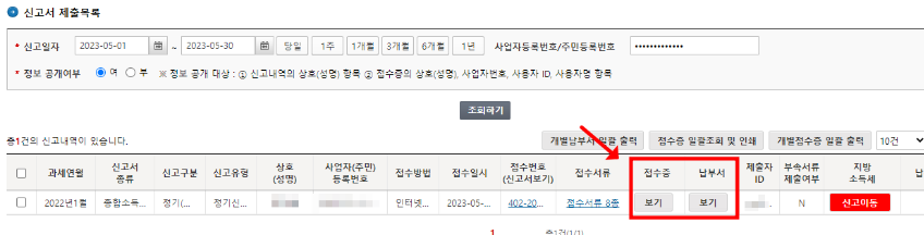 - 신고서 제출목록 내 접수증 보기 클릭.