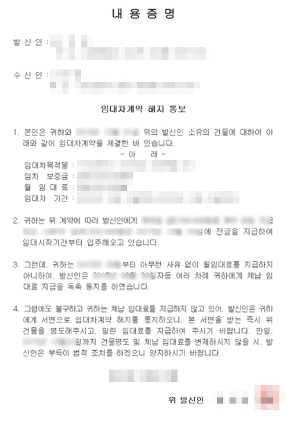 4. 그럼에도 불구, 귀하는 월 임대료를 지급하지 않고 있기에 본인은 귀하에게 서면으로 임대차 계약 해지를 통보 하오니 본 서면을 받는 즉시 위건물을 명도하기 바라며, 밀린 임대료 또한 반드시 지급하기 바랍니다.