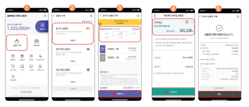 | - 상품권 구매 선택 후 구매하기 선택. - 상품권 권종 선택 - 은행 출금계좌 선택 및 승인 - 상품권 구매 완료 |