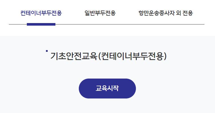 항만운송종사자외 전용 교육과정은 화주와 계약을 체결한 화물차주, 선사와 계약을 체결한 작업자, 항망출입 공무원 및 공공기관 직원등이 교육대상이며, 교육시간은 15분으로 항만 출입전 및 최초 이수일부터 1년이 되는 날까지 매년 이수해야 합니다.