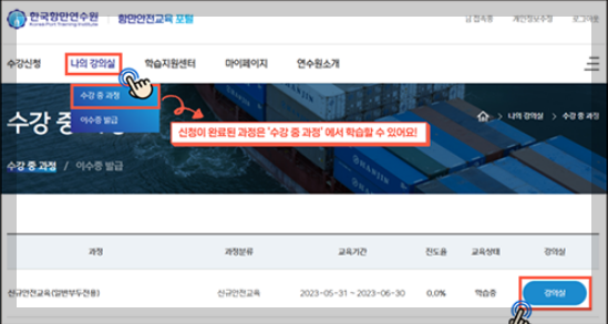 - 수강신청 메뉴 - 과정선택 - 자주 출입하는 부두 확인 - 신청진행.