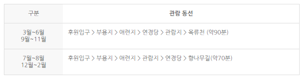 - 혹서기 및 혹한기 관람 동선 : 후원입구 - 부용지 - 애련지 - 관람지 - 연경당 - 향나무길.