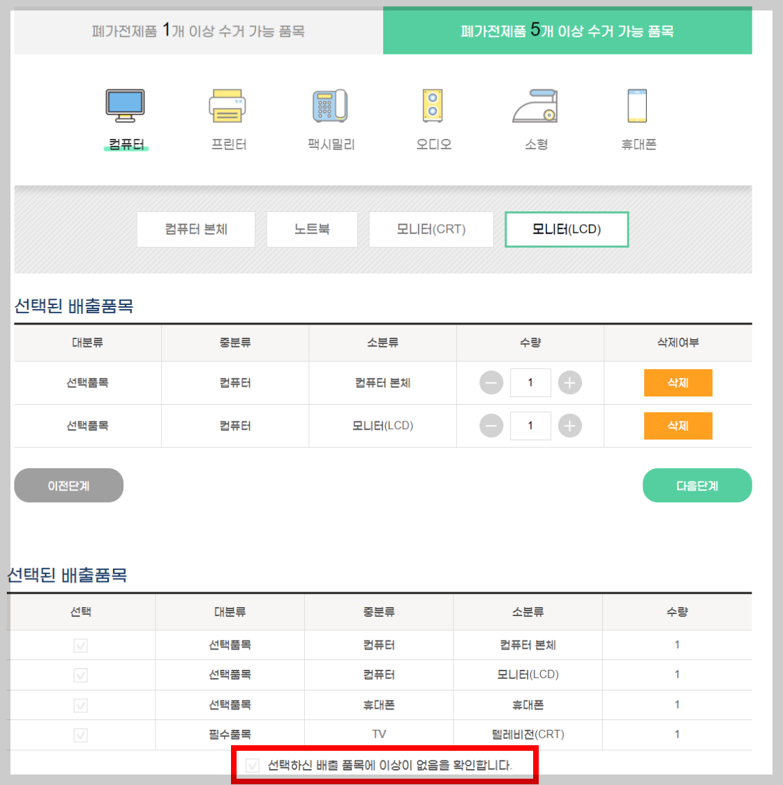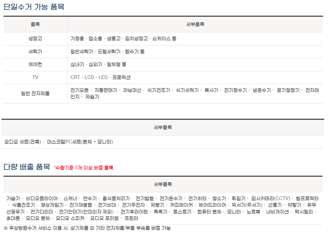 또한 가전제품 단일수거 가능 품목 배출시 다량 배출 품목과 같이 수거 신청이 가능하며 단일 수거 가능 품목이 없을 시 다향배출 품목을 5개이상 신청해야지만 에약이 가능합니다. (*안마의자 수거 불가)