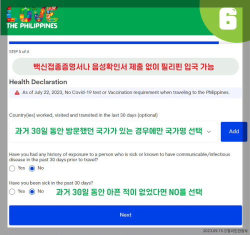 - 6 page : 건강정보 입력 (백신접종증명서 또는 음성확인서 불필요)